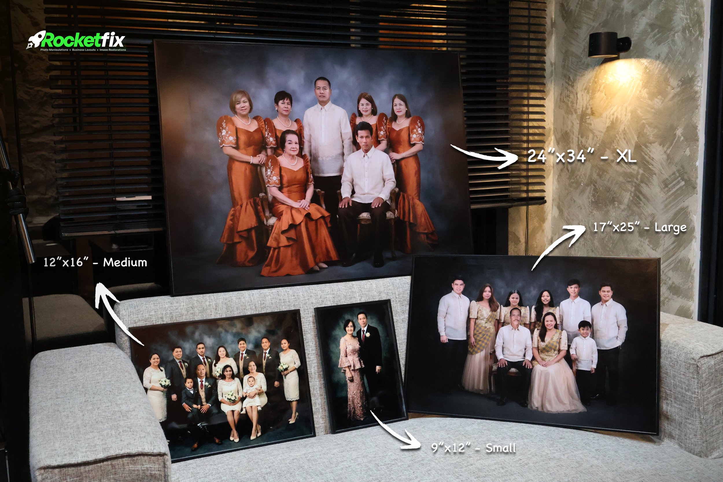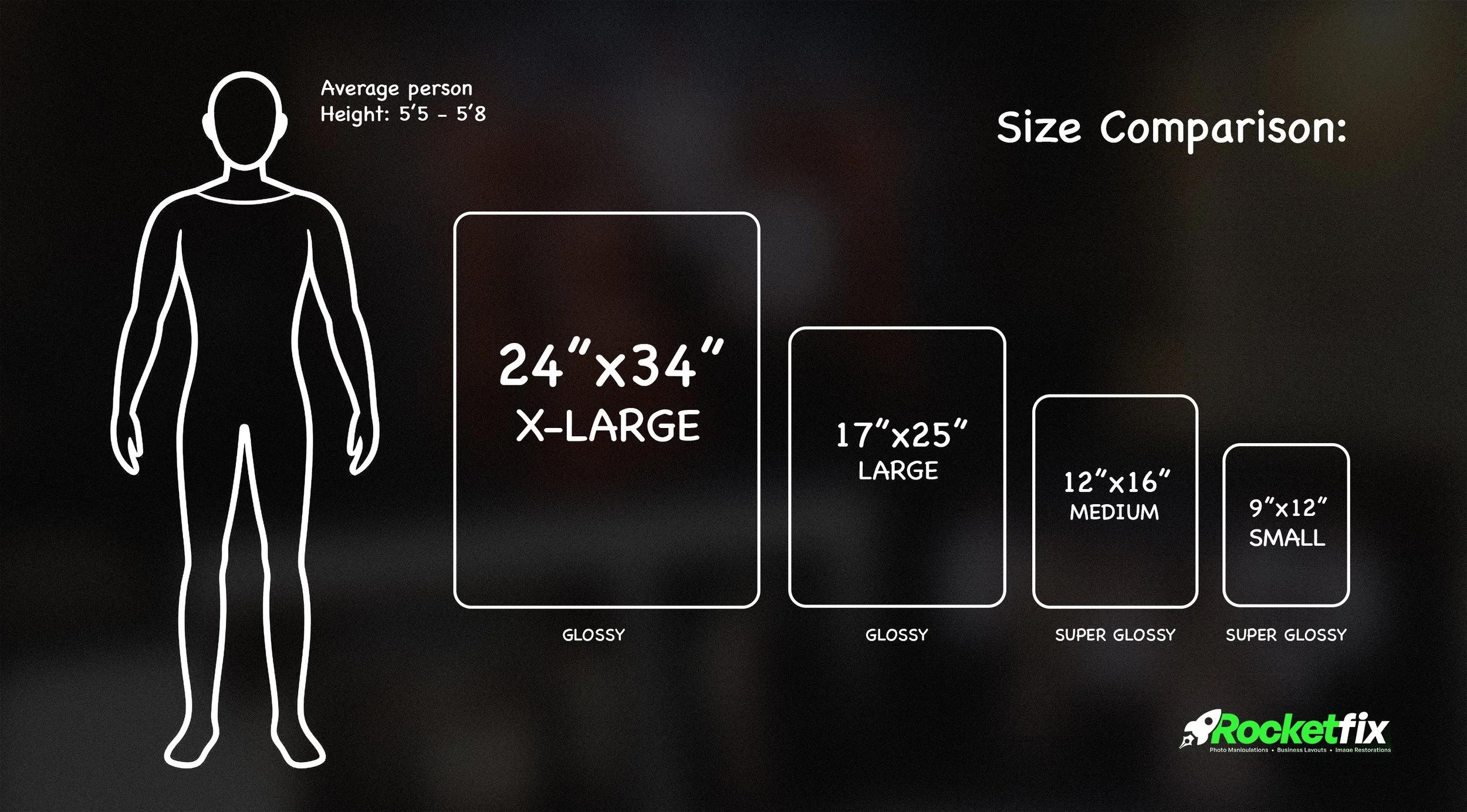 Choose size, then upload your photo. Preview auto-adjusts for portrait/landscape.